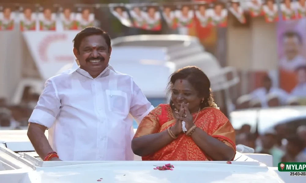 இந்தநிலையில் பாஜகவுக்கு ஒதுக்கப்பட்ட தொகுதியான மயிலாப்பூரில் எடப்பாடி பழனிசாமி பிரச்சாரம் மேற்கொண்டார். அவர் தனது உரையை நிறைவு செய்த போது, பிரச்சார வாகனத்திலிருந்த பாஜக மூத்த தலைவரும் முன்னாள் ஆளுநருமான தமிழிசை சவுந்தரராஜன், மேலே இருக்கும் திறந்த வெளி பகுதியில் எடப்பாடியுடன் நின்று தொண்டர்களை பார்த்து கையசைத்தவாறு வாக்கு சேகரித்தார்.